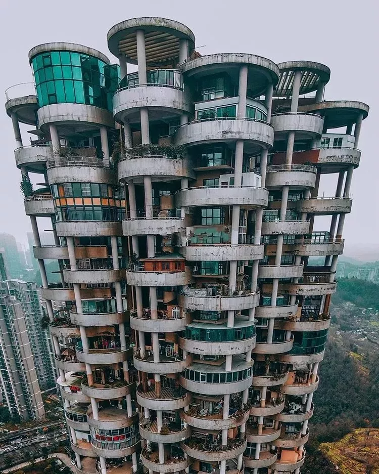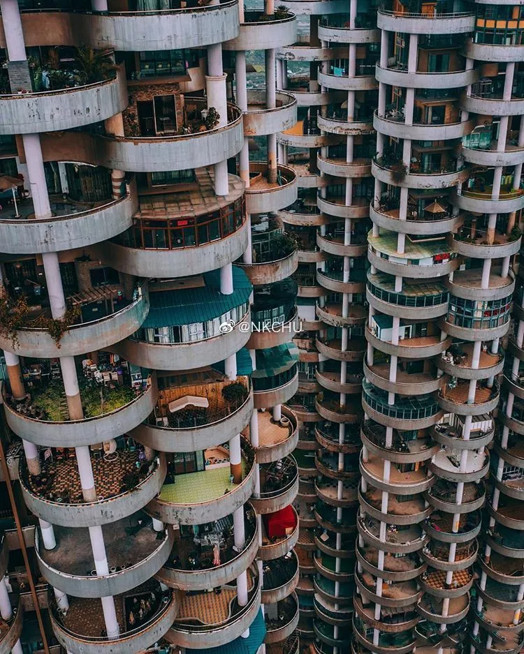 贵阳的龙禧苑, 每一层都是180°无死角的半圆形阳台。 层层叠叠上来,筑成烤面筋大楼, 看过去满满的赛博朋克风, 真想撒点孜然辣椒,来上几串烤面筋。