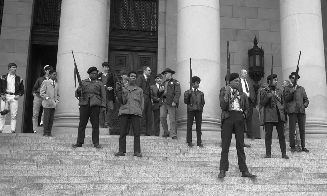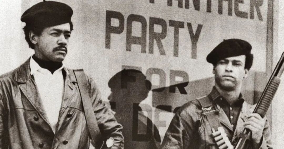 芝加哥警察抬着Fred Hampton尸体,1969年 1969年是黑豹党运动的巅峰,也是结束。在此后的几十年里,弗雷德·汉普顿的幽灵一直萦绕在美国的土地之上,从未散去。弗雷德·汉普顿算是黑豹党的第二代领导核心,在他之前党内还有三大天王:休伊·牛顿(Huey Newton)、鲍比·西尔(Bobby Seale)、艾尔德里奇·克莱弗(Eldridge Cleaver)。Newton(左) Seale(左)Cleaver(右)休伊·牛顿和鲍比·西尔是两个加州奥克兰青年,他们在1966年成立了黑豹党。1960年代的美国充满了风云激荡,中产阶级崛起,反战浪潮涌动,黑人运动此起彼伏,这是一个被古巴导弹危机、披头士、刺杀肯尼迪、鲍勃·迪伦、阿波罗登月、“我有一个梦想”等关键词表征的年代。休伊·牛顿1942年出生于迫害黑人严重的路易斯安那州,由于无法忍受层出不穷的私刑和歧视,50年代他的父母带着他移居加州的奥克兰(Oakland)。在奥克兰Merritt学院念书期间,休伊·牛顿读完了四卷本的《毛泽东选集》,里面给他印象最深的一句话恐怕就是:枪杆子里出政权。除了毛选,休伊·牛顿还广泛阅读了马克思、列宁和切·格瓦拉的作品,这对一个黑人底层青年来说难能可贵(多年后他获得了加州大学的博士学位)。在Merritt学院,他认识了大他6岁的鲍比·西尔,两人一拍即合便成立了黑豹党,休伊担任“国防部长”,鲍比则担任党主席。创立黑豹党几个月后,休伊就去旧金山的中国书店,以每本20美分的价格搬回一百本《毛主席语录》,跑到左的冒尖的加州大学伯克利分校以每本一美元的价格出售[4]。休伊用卖书的利润购买了更多语录,再接着卖出去,如此反复。最后一次,他们把赚来的钱换成了霰弹枪。60年代,加州的法律允许公民持枪上街,即便子弹已经上膛。休伊和黑豹党巧妙地利用了这条法规:每当有警察找黑人的麻烦,黑豹党就会掏出霰弹枪在合法距离内围观,如果警察做出过激行为,党员们就会把武器咔咔咔上膛,用现在的话来说就是:在作死的边缘疯狂试探。 Huey Newton(右)和Bobby Seale(左),1966年