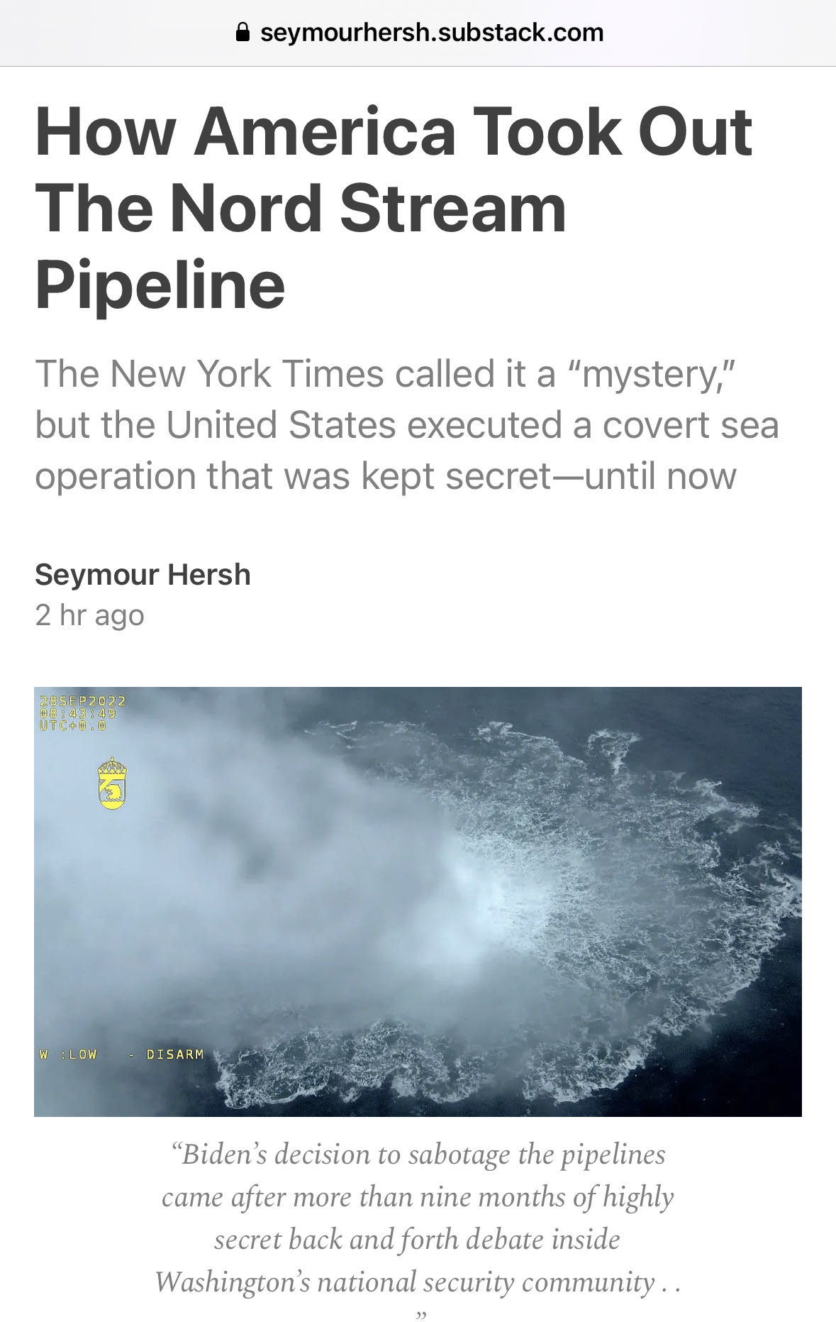 这篇调查报道发表在西摩·赫什个人网站,题为《美国是如何毁掉北溪管道的》。在发布11个小时内,已被英国《泰晤士报》、路透社、法新社、俄新社等各国权威媒体转述,引起广泛热议。