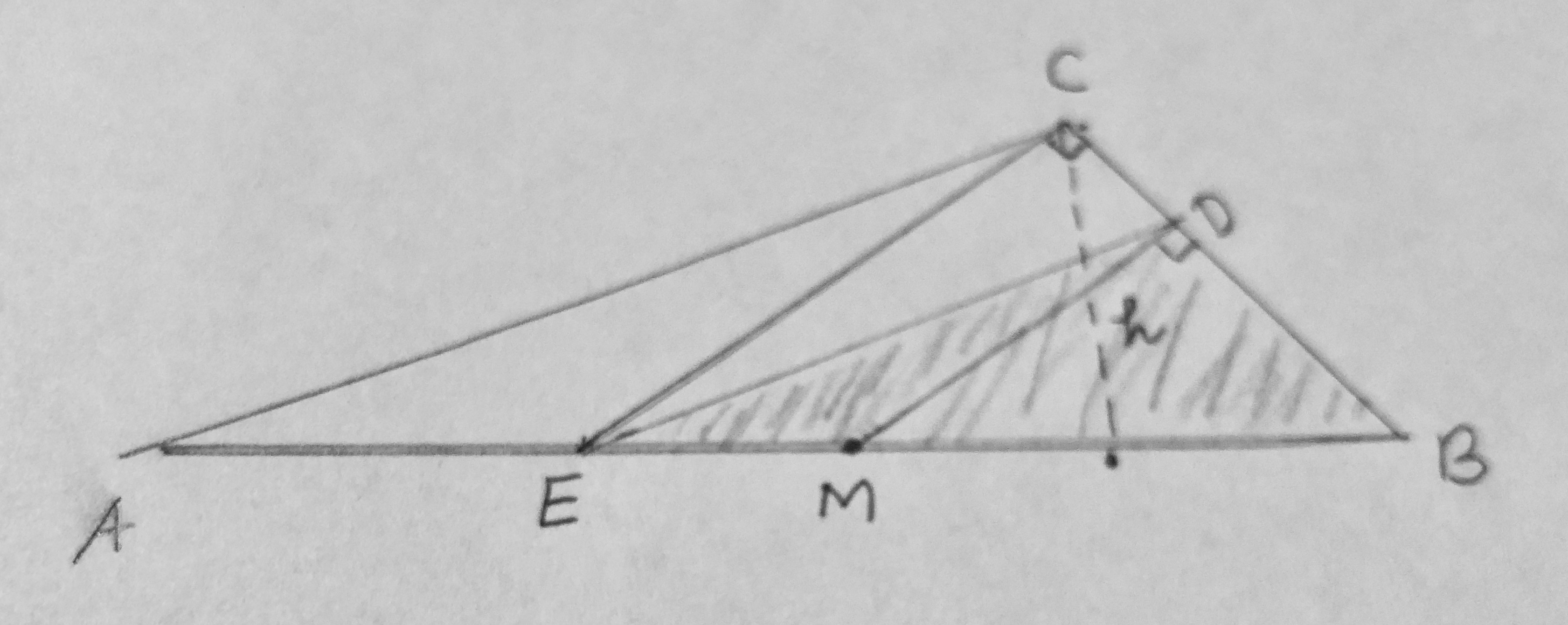 The area of Triangle BED = 12. Proof: The area of Triangle ABC = 1/2 |AB| h = |MB| h = 24, hence h = 24/|MB| ........... (1) The area of Triangle CBE = 1/2 |EB| h = 1/2 |EC|*|BC| .......(2) Subtitute (1) into (2), we obtain : |EB| * 24/|MB| = |EC|*|BC| ............. (3) Triangles ECB and MDB are similar, hence |EB|/|MB| = |BC|/|BD| ......................(4) Subtitute (4) into (3), we obtain : |BC| * 24/|BD| = |EC|*|BC| , or 24 = |EC|*|BD| ............................... (5) On the other hand, we would like to have the area of Triangle BED, which is the difference of the area BEC and the area of DEC. The area of BEC is 1/2 |EC|*|BC|, and the area of DEC is 1/2 |EC|*|CD| , hence their difference is 1/2 |EC|*(|BC| - |CD|) = 1/2 |EC|* |BD|. By (5), this is 1/2 * 24 = 12 . 这是初等平面几何,俺会做的。 |
