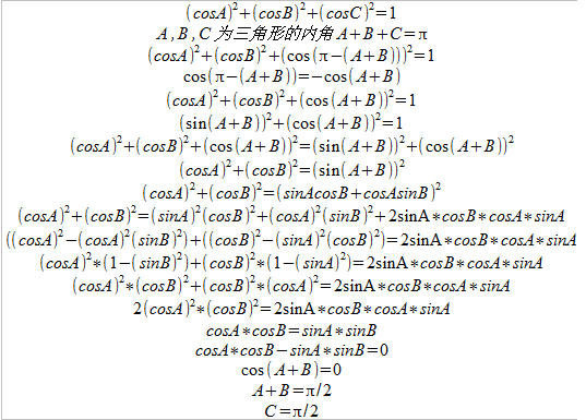 记 a=cos(A), b=cos(B), 则已知条件为 a^2+b^2+cos^2(C)=1...(1) cos(C)=cos(2pi -(A+B)) = cos(A+B)=cos(A)cos(B)-sin(A)sin(B) 则(1)式成为 a^2 + b^2 + (ab - sin(A)sin(B))^2 = 1 或 a^2 + b^2 +a^2*b^2 - 2absin(A)sin(B) +sin^2(A)sin^2(B) = 1 或 a^2 + b^2 +a^2*b^2 - 2absin(A)sin(B) +(1-a^2)(1-b^2) = 1 或 a^2*b^2 = absin(A)sin(B) 或 ab = sin(A)sin(B) 或 cos(A)cos(B) - sin(A)sin(B) = 0 或 cos(A+B) = 0 即 A+B= pi/2 = 90度 所以,我断定,这是个直角三角形。反之,任何一个直角三角形显然都满足给定的等式(1)。 嘿嘿,杨白劳悄悄地问一下,债还得差不多啦? |