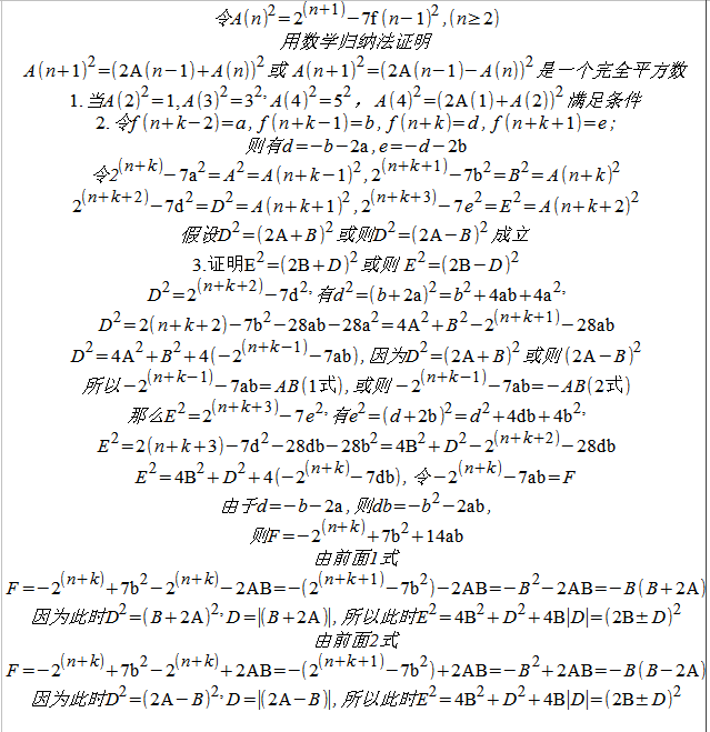 2^(n+1) - 7*[f(n-1)^2]是一个完全平方数。
