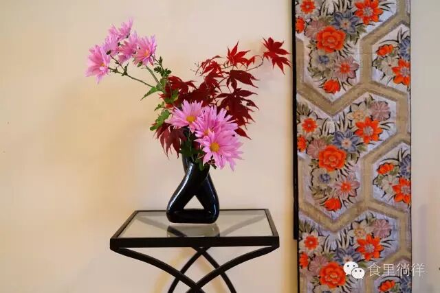 剪一枝红叶,随意插在柠檬黄花瓶。