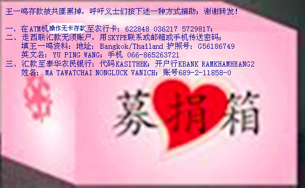 王一鸣存款被共匪黑掉,呼吁广大义士按下述方式之一捐款;