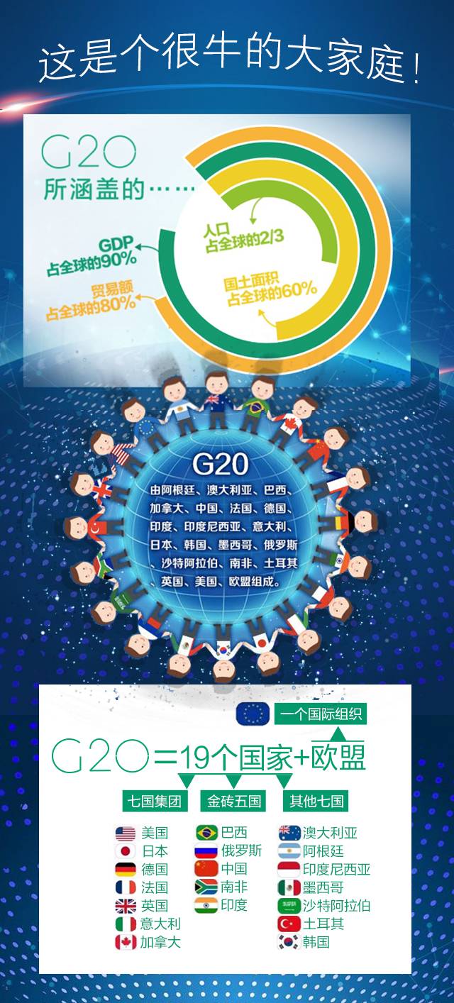 G20所涵盖的人口占全球的2/3,国土面积占全球的60%,GDP占全球的90%,贸易额占全球的80%。