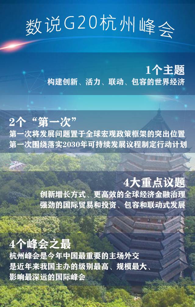 G20领导人第十一次峰会:2016年9月,中国杭州! 杭州峰会是今年中国最重要的主场外交,也是近年来我国主办的级别最高、规模最大、影响最深远的国际峰会。