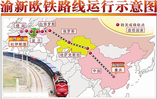 2011年3月19日,“渝新欧”国际铁路联运班列首次全程运行,列车载着惠普在重庆生产的电子产品,从重庆团结村始发顺利抵达德国的杜伊斯堡。时至今日,运行时间16天,比长江水运上海再海运至欧洲节约近30天,比“渝深”铁海联运至欧洲节约近20天。运行成本为空运的五分之一,是IT产品等高附加值货物常态化运输的首选。