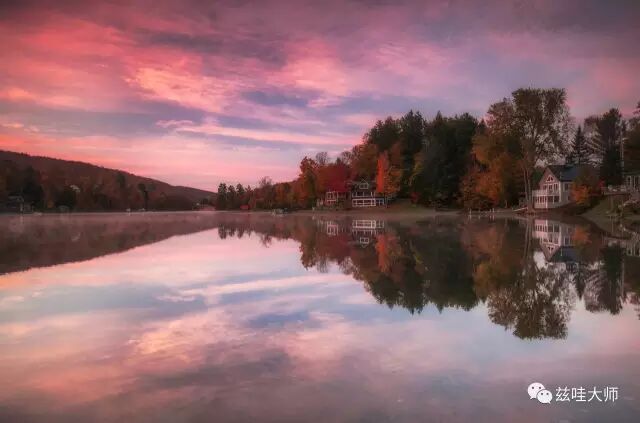 下午进入美国新罕布什尔州,一幅秋水秋空层峦红叶的无垠美景映入眼帘! 古语说的好:“日沉红有影,心定波无痕”。夕阳下的湖光枫色,让人目眩神迷。