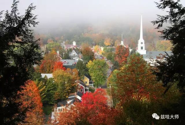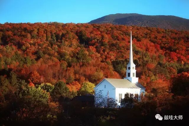 今天我们驾车进入佛蒙特州,来到当地著名的旅游小镇斯托。 高高耸起的尖顶教堂是新英格兰北部山区的特色, 白色的尖顶教堂在漫山红叶中格外耀眼夺目。