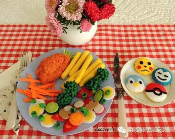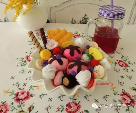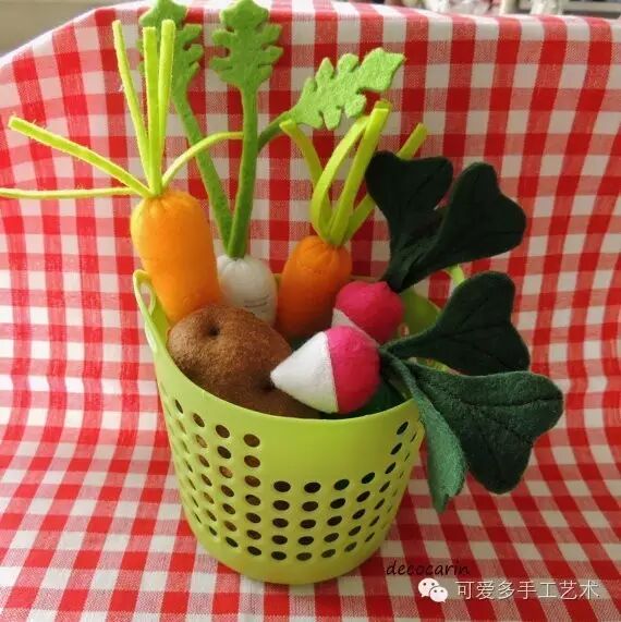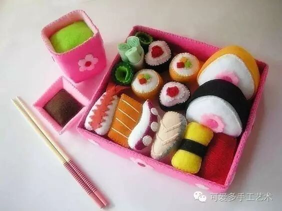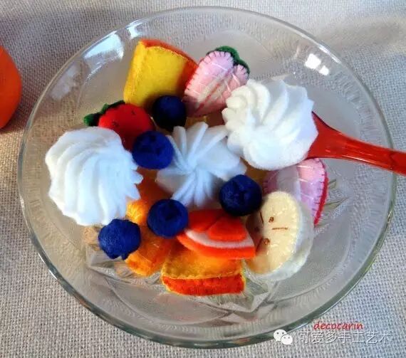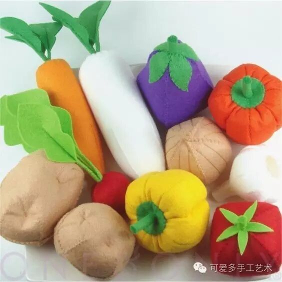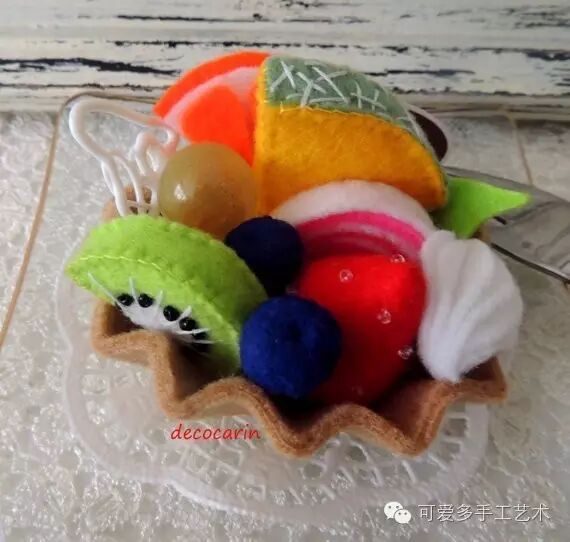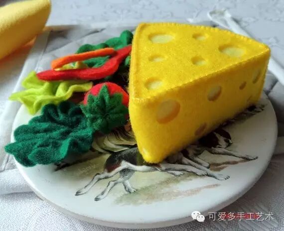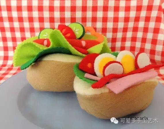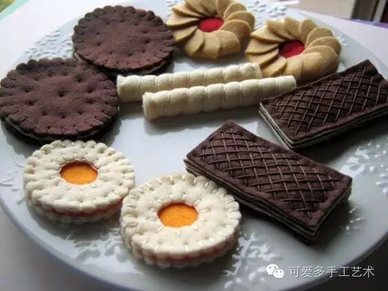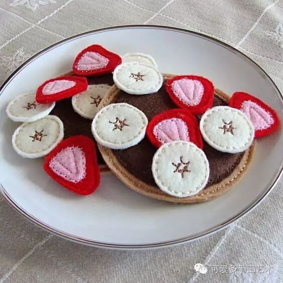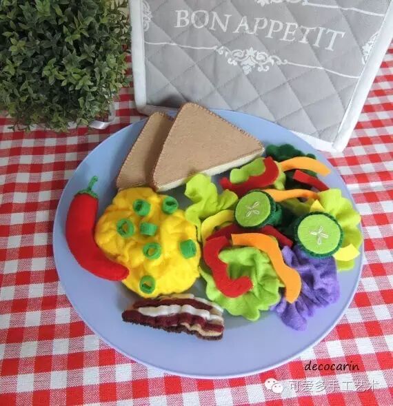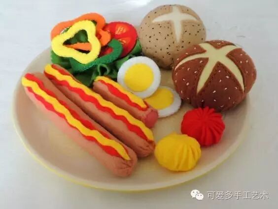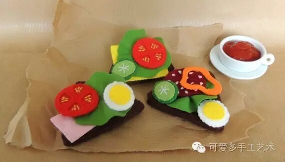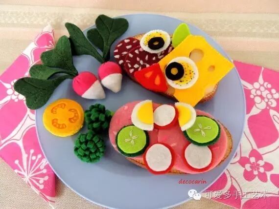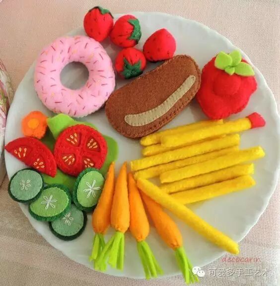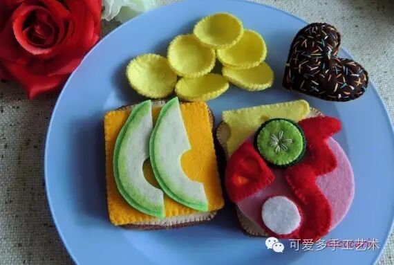 不织布材料比较特别,比一般的布要厚和硬,不会出现棉布掉线等情况,无论是裁剪还是缝合,都能轻松驾驭,用这种材质做出来的食物,无比的逼真,而且色彩明亮丰富又不艳俗,随时可根据自己喜欢的颜色来搭配做出令人“食欲大增”的食物,虽然做出来的食物到最后不能吃,但是,每天看着这些自己DIY的食物,幸福感油然而生。