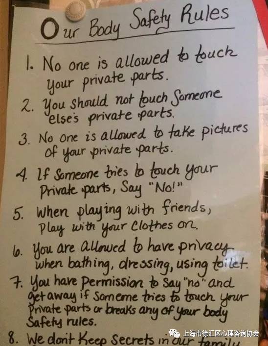 1、不允许任何人触摸我的私处 2、我也不能触摸别人的私处 3、如果有人试图触摸我的私处,马上说不、离开 4、不允许任何人给我的私处拍照 5、和朋友或大人一起玩的时候,要穿衣服 6、关上门,独自上厕所、洗澡、穿衣服 7、如果有人破坏了这些 Body Safety Rules,马上告诉爸爸妈妈 8、不对家里人保守秘密;如果有人让我保守一个秘密,我会把这个秘密告诉家里人