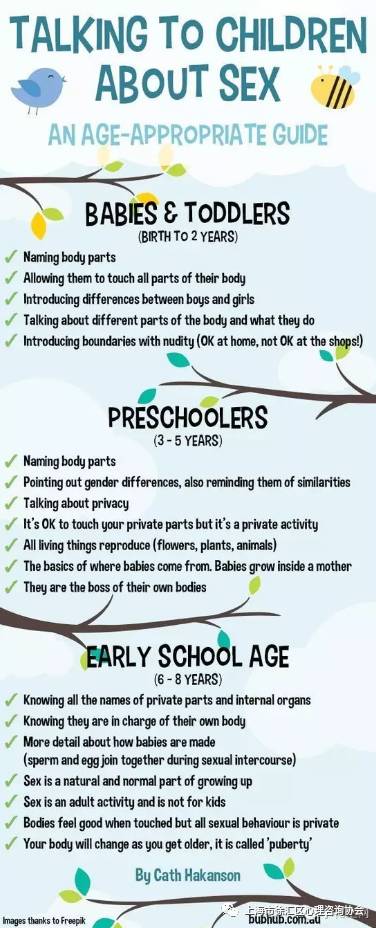 在英语国家,学校教育以外,家长们也有义务和孩子聊“性”这个话题,大家给这种聊天起了一个有趣的名字,叫:Birds and Bees Talk;即使这样,很多家长也会觉得不知道怎么说,不太好意思说。所以,下面这张图在亲子聊 sex 方面用得很多,算是一个8岁之前的“家庭性教育大纲”。