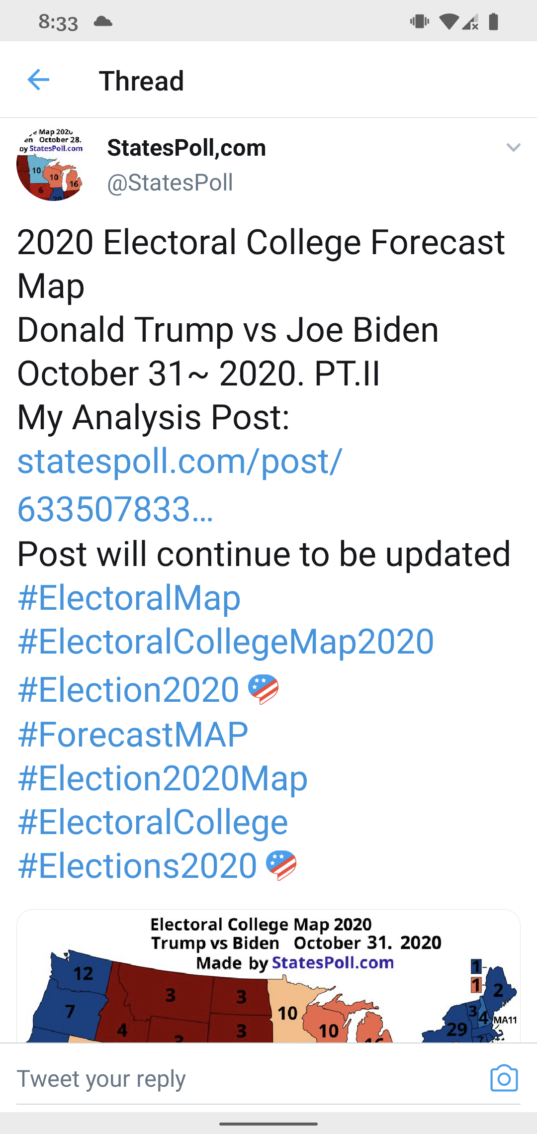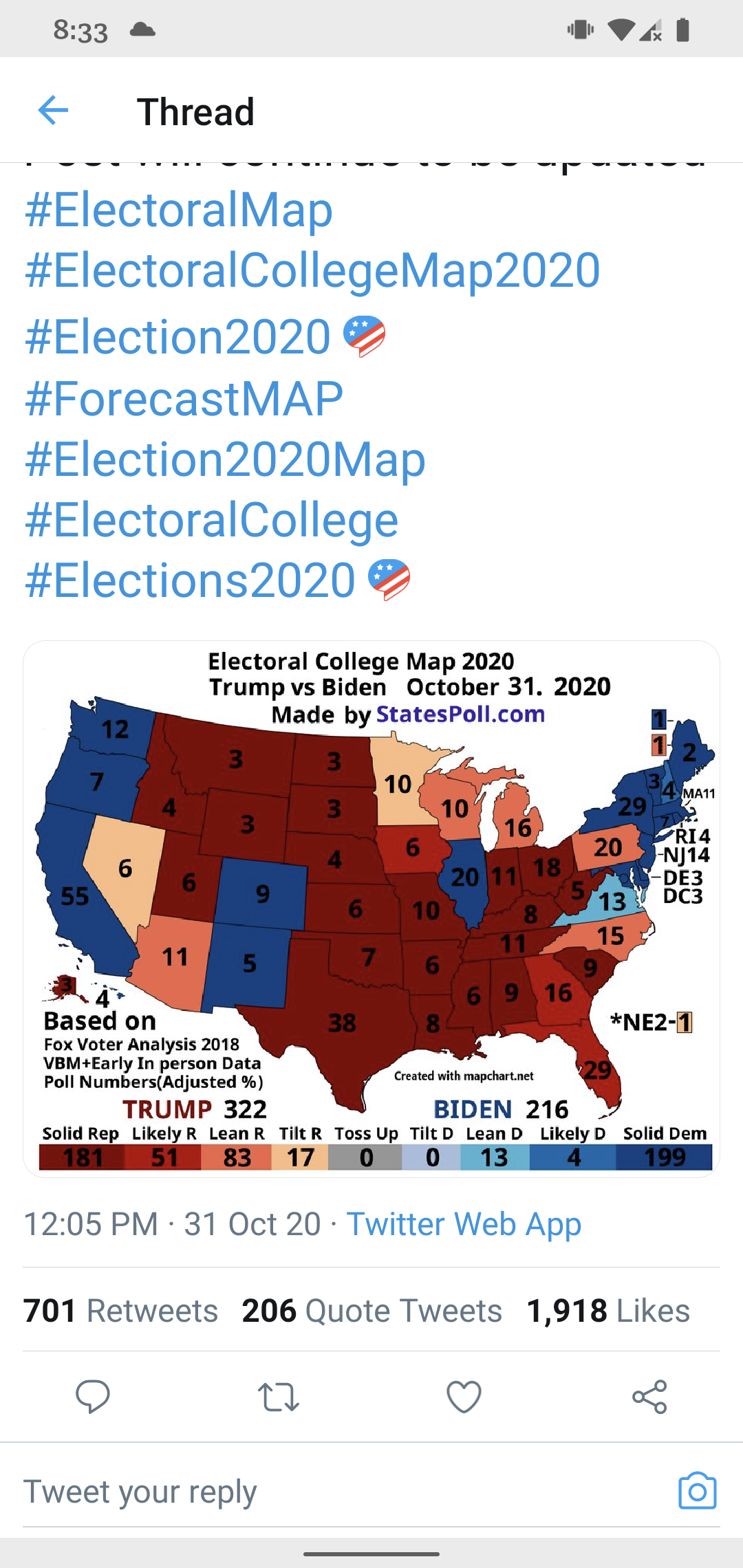 NE的5票因为不采用选举人团制度,故尚有1至2票呈拉锯,但也偏红;其余已定为红。