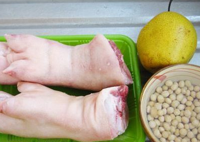 雪梨1个、大豆50克、猪脚半只、姜片3片、盐,猪脚加入姜片飞水去异味,分成块;加入去核切块的雪梨、大豆和一块姜,加足清水煮到滚开盖维持旺火继续沸煮15分钟转慢火再煲1个小时,汤就煲好了,喝之前根据个人口味加盐调味。