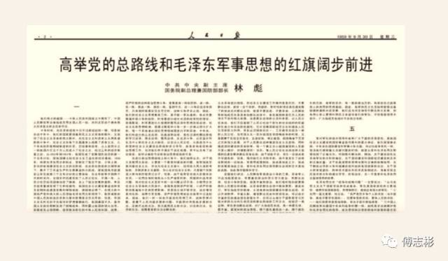 原创 2017-10-26 傅志彬 傅志彬 作为十大元帅之一的林彪在1949年以后基本以养病为主。他在1959年8月庐山会议后重新出山,担任中共中央军委主持工作的副主席兼国防部长。 上台伊始,刚下庐山,在1959年9月批判彭德怀的军委扩大会议上,林彪说:“我们学习马克思列宁主义怎样学呢?我向同志们提议,主要学习毛泽东同志的著作。这是学习马克思列宁主义的捷径。马克思、列宁的著作那么多,里面有许多人名地名你都搞不清。最好先读毛泽东同志的著作。……毛泽东同志全面地、创造性地发展了马克思列宁主义,综合了前人的成果,加上了新的内容。 ……我们学毛泽东同志的著作容易学,学了马上可以用,好好学习,是一本万利的事情。” 在开完军委扩大会议后,为庆祝中华人民共和国成立10周年林彪在《人民日报》发表题为《高举党的总路线和毛泽东军事思想红旗阔步前进》。