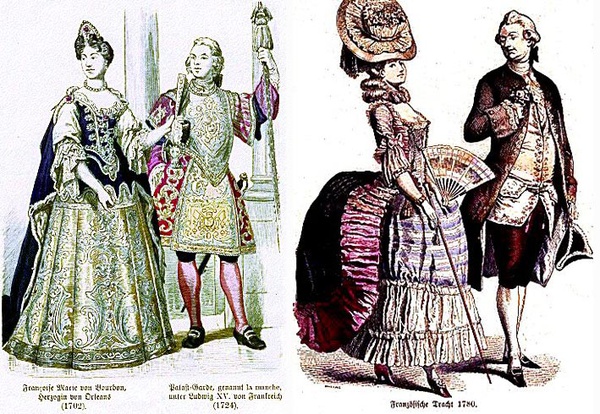 是现代西装的原型,男性外套逐渐变成直线条,常伴随前短后长的设计。同时也出现了领子的设计,袖子也有原来的大开口变成了贴合手臂的款式.1715年以后,裤子多用亮色, 1760年,男上衣开始去掉多余的修饰,缓解紧束的腰身,这种上衣称作夫拉克这是燕尾服的原型,也是现在的晨礼服的始祖,用料仍是丝绸,常有印花或条纹图案。