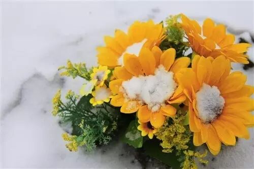 饱含露珠的花儿依然茁壮成长, 无畏风雪。
