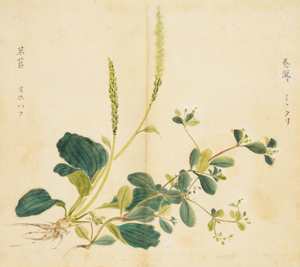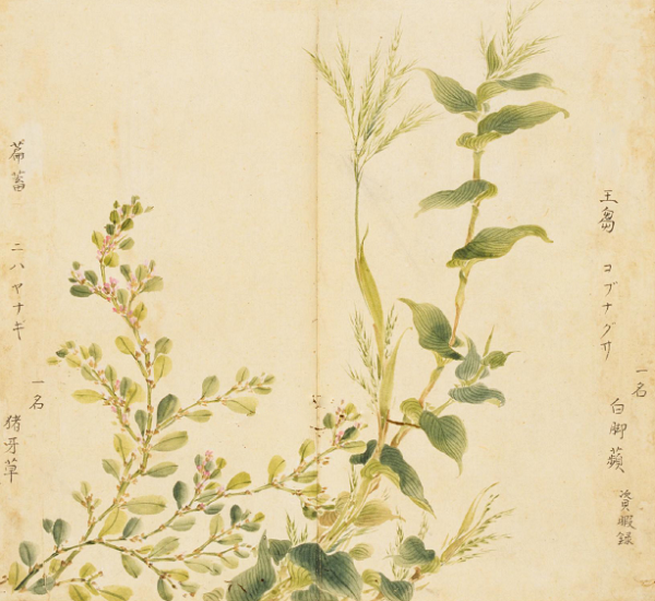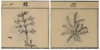 细井徇干脆就不做判断,只在绿竹一图旁边写下“绿竹”字样,紧接着附上了萹蓄和荩草的图样: