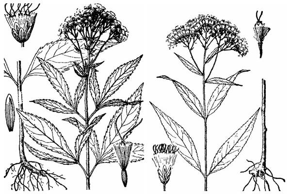 下面这张是佩兰和泽兰的线条图,左边的是佩兰,右边的是泽兰。佩兰叶多为三全裂或三深裂,而泽兰叶多是边缘为锯齿状的披针形叶。