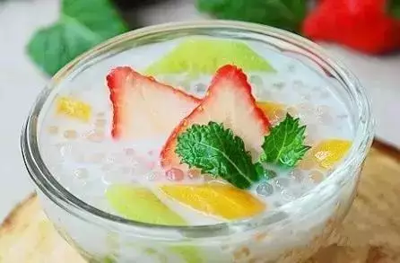 做法:西米洗净后,倒入沸水中;煮到西米半透明,把西米和热水隔开;再煮一锅沸水,将煮到半透明的西米倒入沸水中煮,直到全透明,将沸水都倒去;煮一小锅牛奶并加少许糖;将西米倒进牛奶中煮至开锅;将煮好的西米牛奶晾凉,加入水果丁,即可。