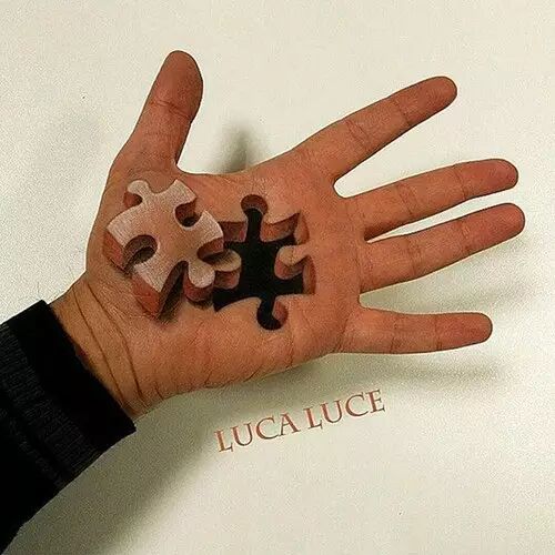 卢斯将阴影艺术和逼真绘画有机结合起来,并将它们融入到自己独特的手掌绘画作品中,创造出惊人的三维图像,让人仔细观看后会恍然大悟。举例来说,卢斯在手掌上绘制了一块拼图,左侧则留有洞,整幅创作十分逼真。