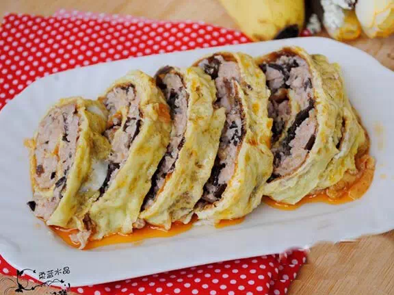 5.将打好的猪肉馅里,加入生抽、料酒、胡椒粉搅匀。 6.把木耳和银耳切碎,加入到猪肉馅里,拌匀。 7.将拌好的馅,均匀的平铺在蛋皮上面。