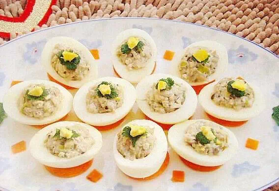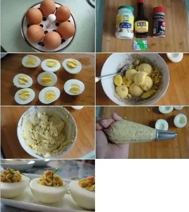 1.鸡蛋煮熟或蒸熟(只用4个)。 2.准备材料。 3.煮好的鸡蛋对半切开。 4.将蛋黄挖出,15g沙拉酱,5g寿司醋(白醋),青芥末5g,1.5g黑胡椒粉,适量盐(放不放都可以)混合均匀。 5.用勺子压成泥。 6.装入裱花袋。 7.挤入蛋清托,表面加葱叶,香肠粒装饰即可。