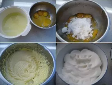 1.蛋黄、蛋清分开,放入两个容器中。 2.将白糖放入蛋黄中。 3.用打蛋器将蛋黄打成泡沫状,打到蛋黄发白,就打到位了。 4.用打蛋器将蛋清打成泡沫。