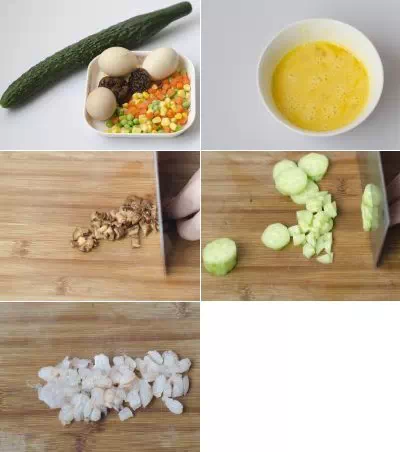 1.准备的部分材料 2.将蛋打散 3.香菇切丁 4.青瓜去皮,切丁 5.将虾仁去线,切丁