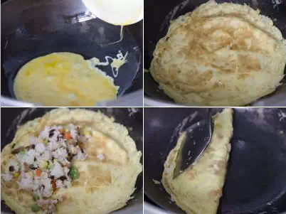 11.热油锅,蛋液平缓且均匀的下锅 12.鸡蛋饼翻一个面 13.将炒饭放入蛋皮中间 14.迅速蛋皮固定,盛入盘中,淋上蕃茄酱即可
