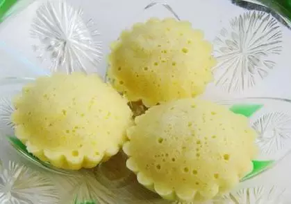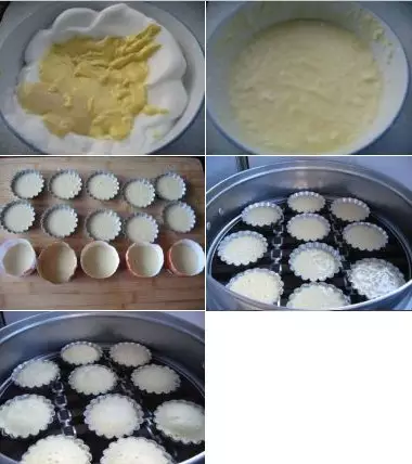 5.将蛋黄倒入蛋清中。 6.再倒入面粉拌匀。 7.将鸡蛋糊倒入模具中。 8.上蒸锅蒸15分钟。 9.这是蒸好的鸡蛋糕。