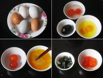 主料:咸鸭蛋2个、鸡蛋2个、皮蛋1个 辅料:油适量、料酒适量、清水适量