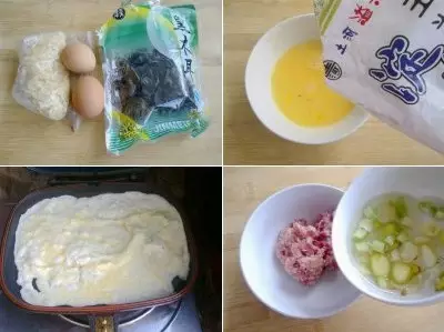 1.准备好食材,木耳和银耳要提前浸泡两小时,直到体积变大。 2.鸡蛋打散,里面加入少量玉米淀粉。 3.将蛋液搅拌均匀后,锅里倒入油,将蛋液摊成蛋皮。 4.将葱姜蒜切碎,加入开水,浸泡10分钟。将泡好的葱姜蒜水,少量分次的,加入到猪肉馅里,每加入一次,要用筷子搅拌均匀。