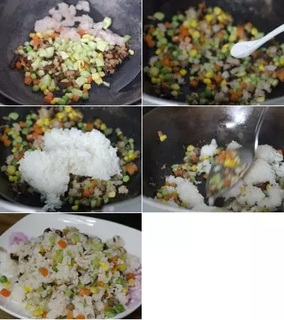 6.锅内热油至七分热时倒入除剩饭外所有的炒饭材料翻炒两分钟 7.放入适量的盐 8.放入剩饭 9.用铲子压平,不断翻炒,直到剩饭分成一粒一粒的 10.盛出备用