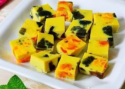 1.主要原料豆腐大约200克,鸡蛋3枚。 3.蒸好的豆腐片去老皮,切成一厘米见方的丁。 4.鸡蛋打入碗中,加入食盐。