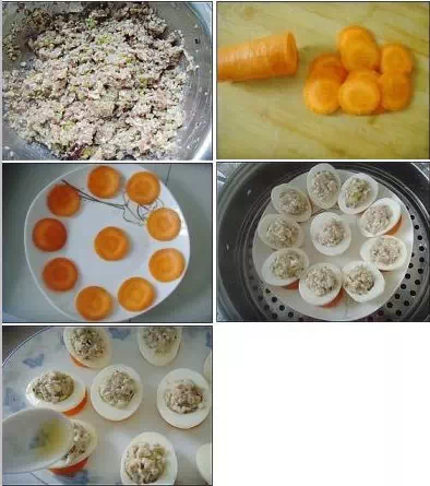 9.然后搅拌均匀成馅料 10.胡萝卜洗净切10片圆片 11.将切好的胡萝卜片整齐摆放在圆盘中 12.将调好的馅料填入蛋白,然后将填好馅的蛋白放到胡萝卜片上。蒸锅中放适量水,用大火烧开,将装好盘的鸡蛋上屉蒸约10分钟 13.上桌前换大盘,在馅料上淋入蒸鸡蛋时留出的汁,再加香菜与些许蛋黄点缀即可