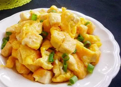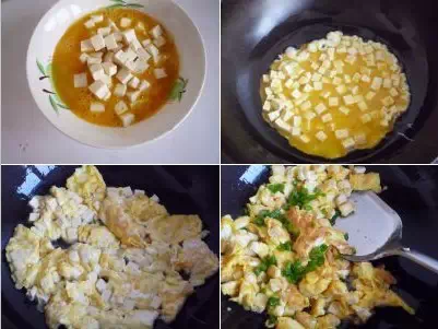 5.加入食盐的鸡蛋打散。加入切好的豆腐丁拌匀。 6.锅中放油烧热,倒入拌匀的鸡蛋豆腐。 7.中火推炒至鸡蛋熟透。 8.撒入一些准备好的香葱末,翻炒均匀即可关火出锅。