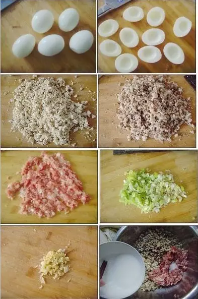 1.将鸡蛋煮熟去壳 2.对半切开,小心取出蛋黄,10瓣蛋白备用 3.豆腐切碎 4.蘑菇洗净后切细末 5.猪肉剁成肉糜 6.葱切成细末 7.姜也切碎 8.将切好的原材料加入盐,鸡精,料酒,生抽,白胡椒粉,水淀粉