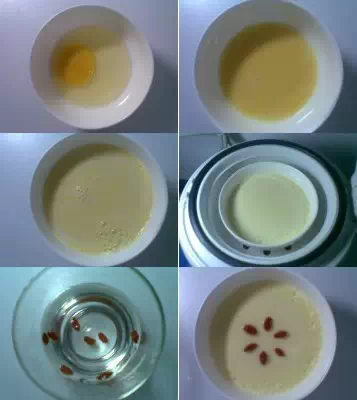 主料:牛奶100ml、鸡蛋1个 辅料:白糖适量、枸杞6g