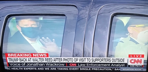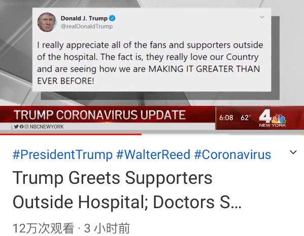 川普總統十月一日新冠確診,二日從白宮由直升機送華府附近的軍醫院就醫。在醫院總統繼續工作,並在十月三日發表視頻講話,感謝醫生護士的卓越工作,也感謝世界各國人民,包括美國各界人士,對自己的親切慰問和良好的祝願。他還說自己的情況已經大有改善,很快就會戰勝病魔。