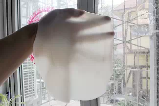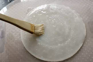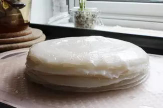 12.面皮稍凉后可从盘中揭下。蒸好的面皮是半透明的,很有韧性。