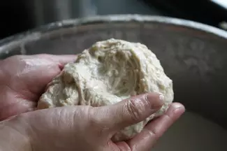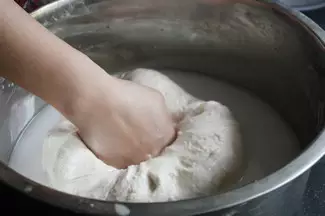 3.找个大点的盆,倒入一点凉水,不要没过面团,在面团一半的位置为宜,开始洗面。就是在水里揉面。