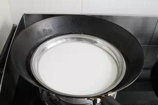 10.在平盘里倒一勺面水,放入已经烧开水的锅中,盖上锅盖隔水煮三分钟左右,面皮的薄厚自己掌握。