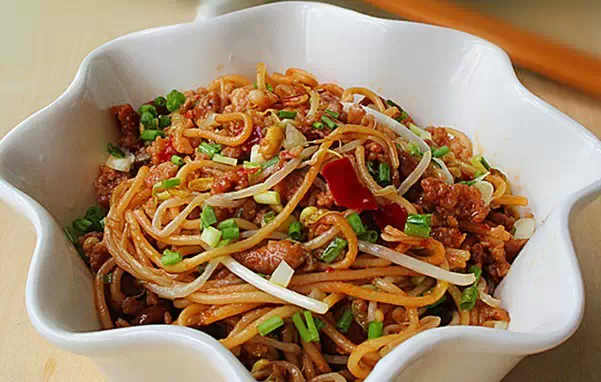 1,电热杯烧开水,把手工面放入电热杯中煮熟,然后马上捞出来放凉水里面浸一下,然后再捞出来,把水滴干放盘子里,拌一点儿香油控,防止面条黏在一起。