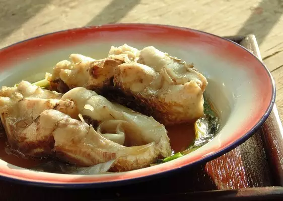 4,待电饭,锅跳到保温时,再闷五分钟左右,把鱼取出,将蒸鱼的汁水再把鱼浇一遍。