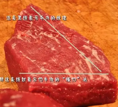 【牛肉】牛肉要横切,因为牛肉的筋腱较多,并且顺着肉纤维纹路夹杂其间,如不仔细观察,随手顺着切,许多筋腱便会整条地保留在肉丝内。这样炒出来的牛肉丝,就很难嚼得动。