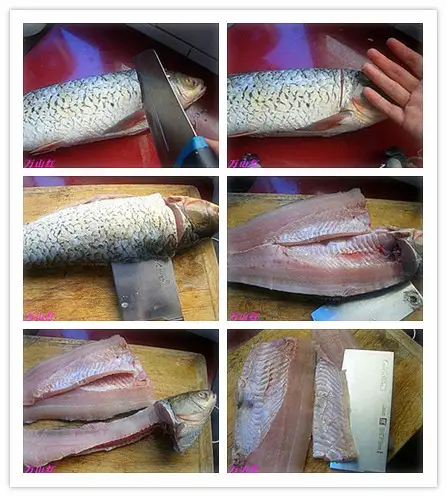 1.先把整块的鱼肉片切下来:鱼头下面横切一刀,先从鱼皮下面挑出鱼线,这条线很腥,然后沿鱼骨处下刀,切下一半的鱼肉,两边一样的切法,就把整片的鱼肉切下来了。然后沿鱼刺方向再把刺去掉,就得到完整的两片鱼肉了。