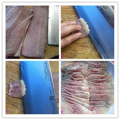 2.切片:从鱼肉的下面开始切,抹刀法切片,片约5毫米厚的片,鱼皮也一起片下来,也可以片连刀片,片好的鱼片可以做糖醋鱼片,番茄鱼片等等