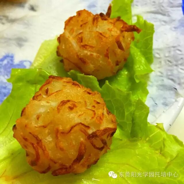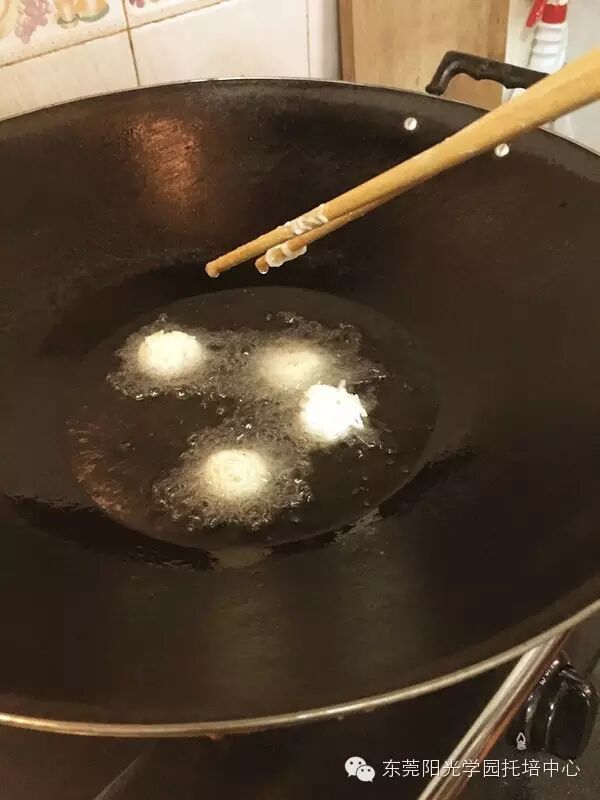 6.起油锅,当筷子伸入起小油泡即可将萝卜丝整成圆球放入油锅内炸至表面金黄即可(中火炸熟)