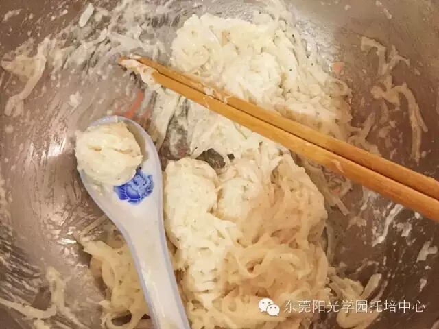5.胡萝卜有水分不需要加水,面粉慢慢加入搅拌均匀,如果觉得稀了就再加一点。